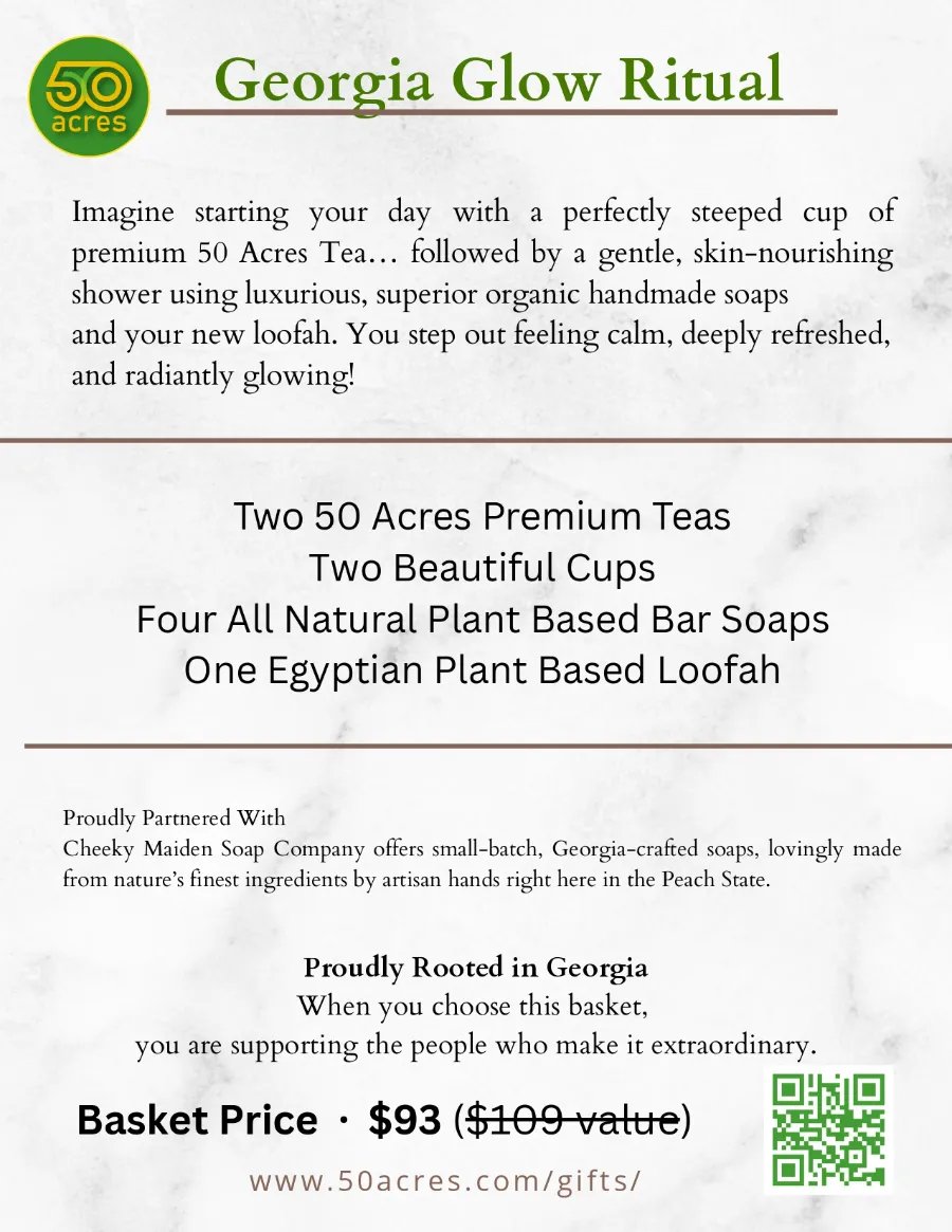 Imagine starting your day with a perfectly steeped cup of premium 50 Acres Tea… followed by a gentle, skin-nourishing shower using luxurious, superior organic handmade soaps and your new loofah. You step out feeling calm, deeply refreshed, and radiantly glowing!