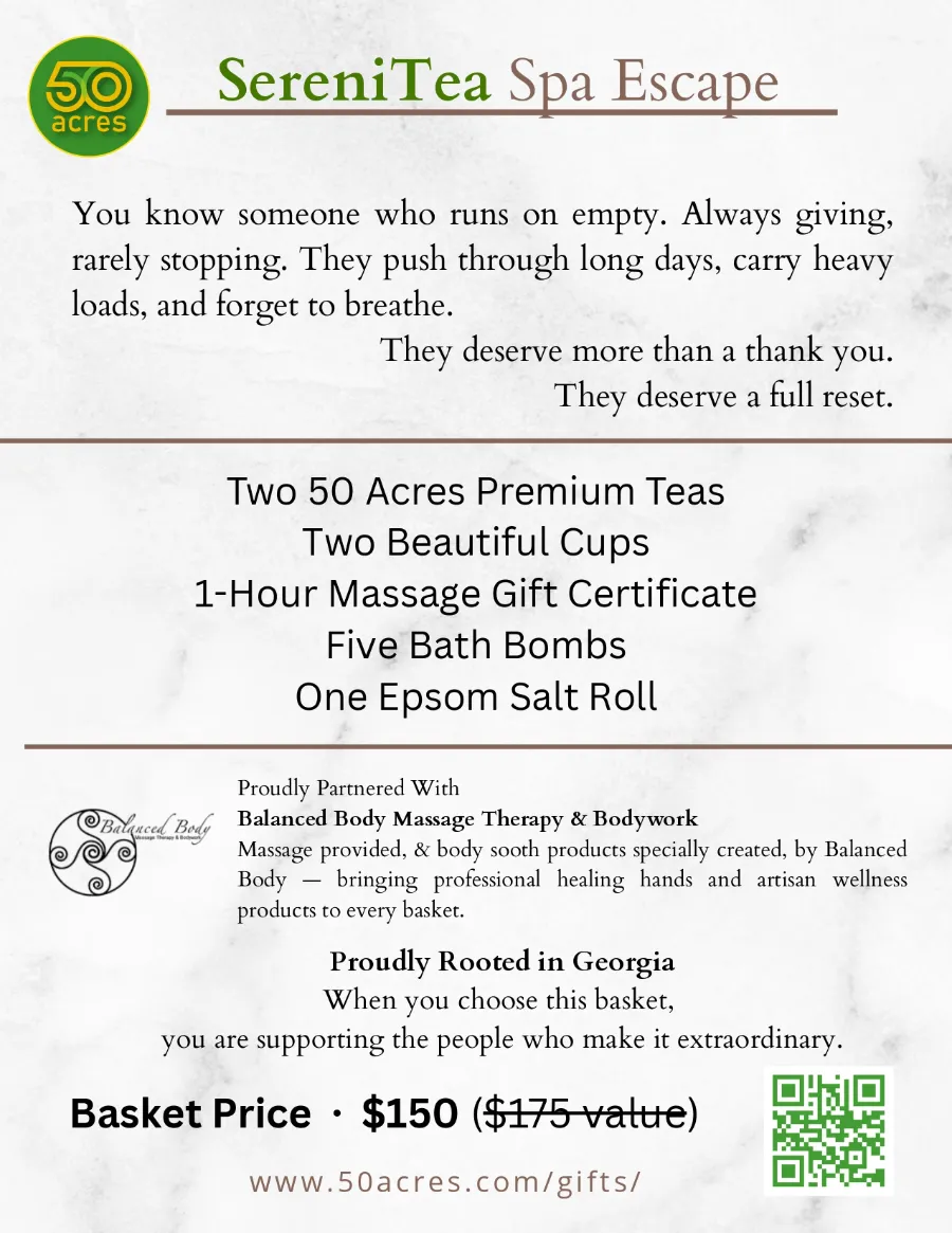 Massage provided, & body sooth products specially created, by Balanced Body — bringing professional healing hands and artisan wellness products to every basket.